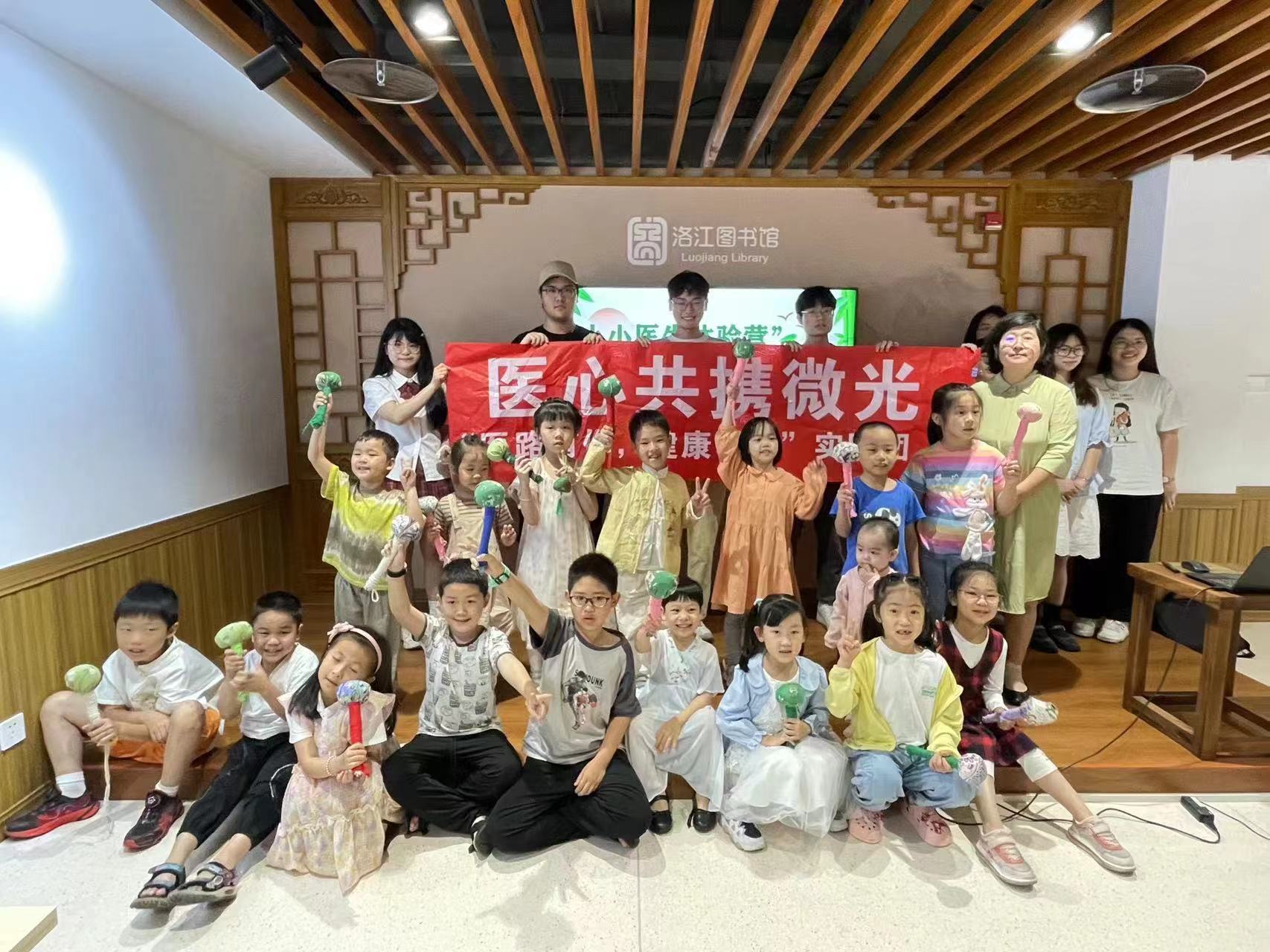 6月8日,实践团前往泉州市洛江区图书馆,结合端午节文化健康教育开展科普讲座。实践团结合场地中医文化特色,为现场的小朋友们分发艾草及相关材料并进行组装演示,引导大家为陪同父母捶捶背,宣传便捷的中医治疗手段方式。