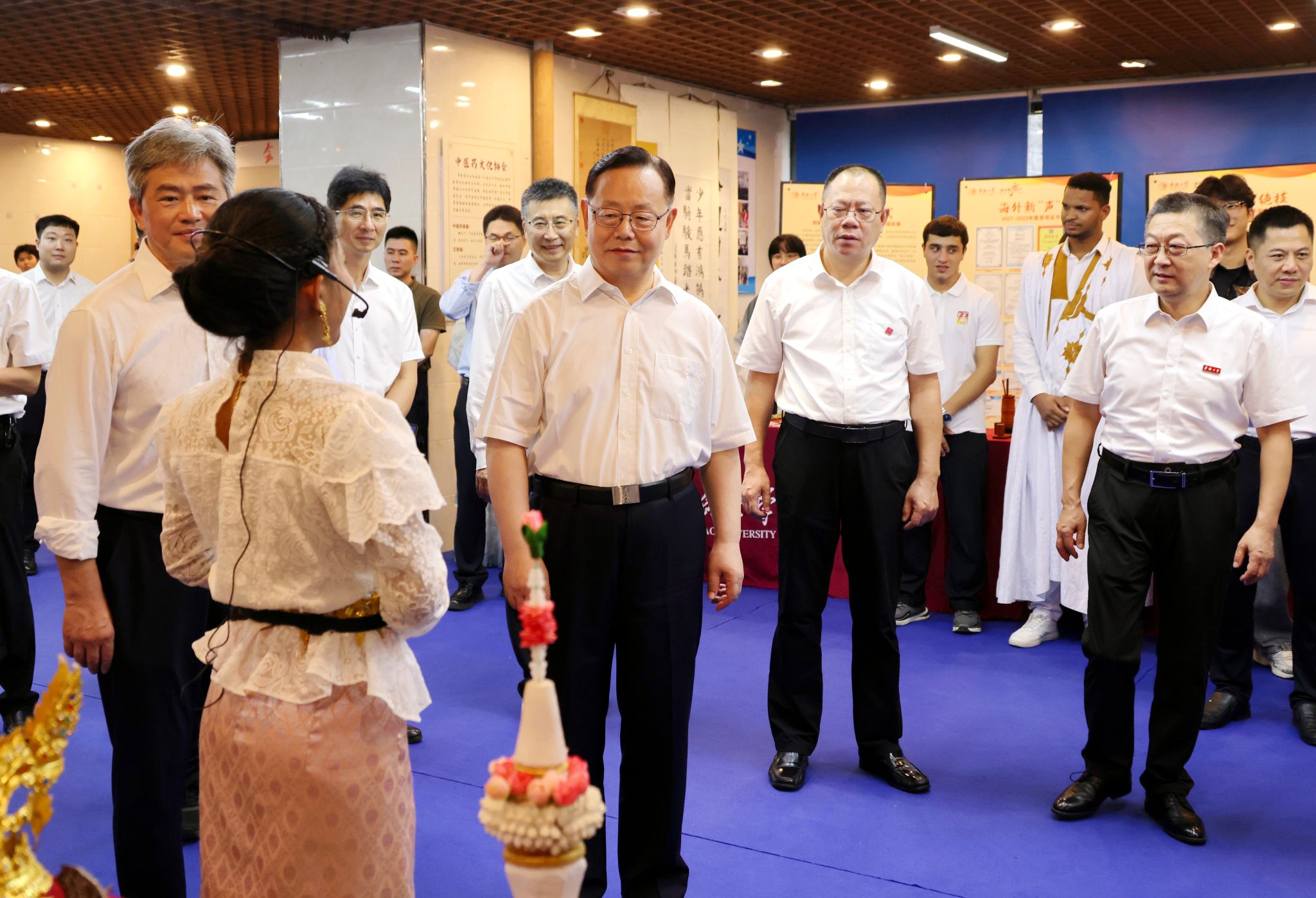 在华侨大学党委书记徐西鹏、校长吴剑平等陪同下,蒋作君一行还参观学校校史校情展和学生中外文化交流展,了解学校办学基本情况,与境内外学生亲切交流。