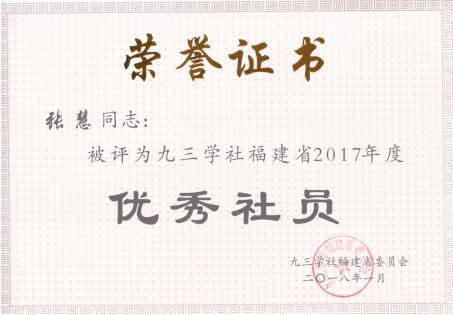 近日,九三学社福建省委八届二次全委(扩大)会议在福州召开。会议传达学习中共十九大和九三学社十一大精神。副省长、九三学社省委主委洪捷序出席。福建省委统战部常务副部长臧杰斌出席并讲话。会议对贡献突出的组织及个人进行了表彰,我校九三学社社员张慧副教授被评为“2017年度优秀社员”。
