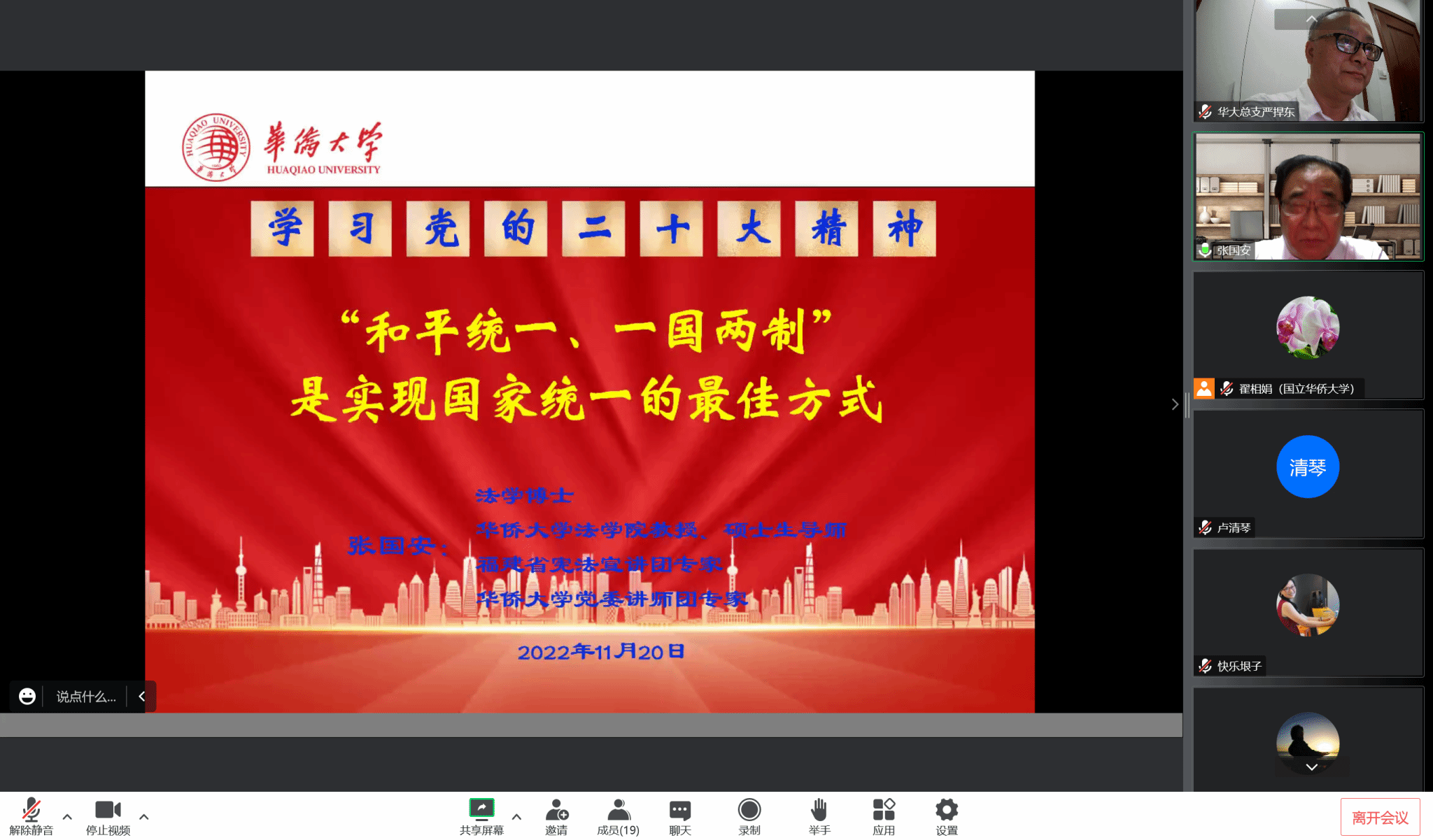 11月20日晚,中国致公党泉州市委会华侨大学总支部开展“中共二十大精神”集体学习活动,本次学习以线上方式进行,邀请校党委宣讲团成员、法学院张国安教授做专题学习辅导报告。
