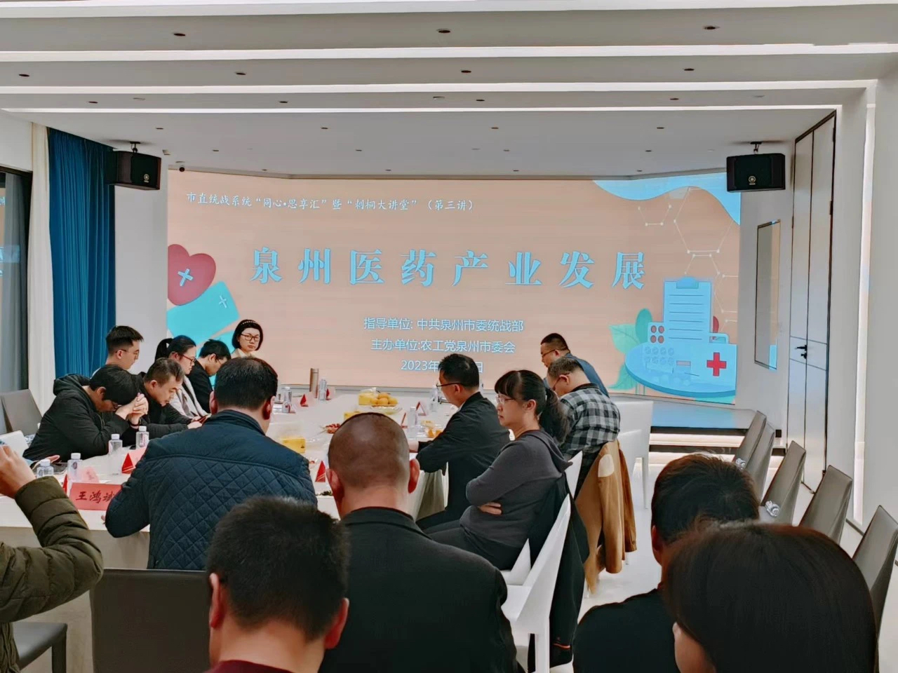 12月1日,在中共泉州市委统战部的指导下,农工党泉州市委会主办市直统战系统“同心.思享汇”暨农工党泉州市委会“刺桐大讲堂”(第三讲)主题讲座。讲座以“泉州医药产业发展”为主题,聚焦泉州市医药产业发展形式,助推泉州市医药产业高质量发展。中共泉州市委统战部四级调研员王鸿斌,农工党泉州市委会专职副主委王蔚,市直统战系统各单位及农工党党员代表共50多人参加活动。