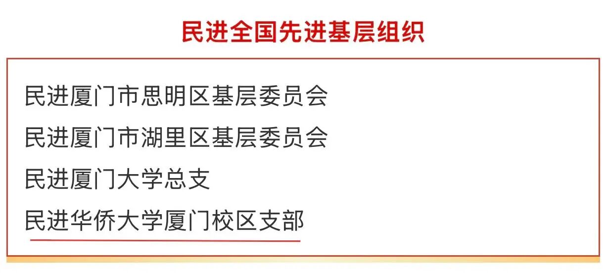 为表彰先进、树立典型,鼓舞和激励民进各级组织和广大会员奋勇争先、再建新功,在12月9日召开的庆祝中国民主促进会成立80周年大会上,民进中央授予76个地方组织“民进全国先进地方组织”称号,授予486个基层组织“民进全国先进基层组织”称号,授予223名同志、追授2名同志“民进全国‘双岗建功’优秀会员”称号。其中,民进华侨大学厦门校区支部获评民进全国先进基层组织。